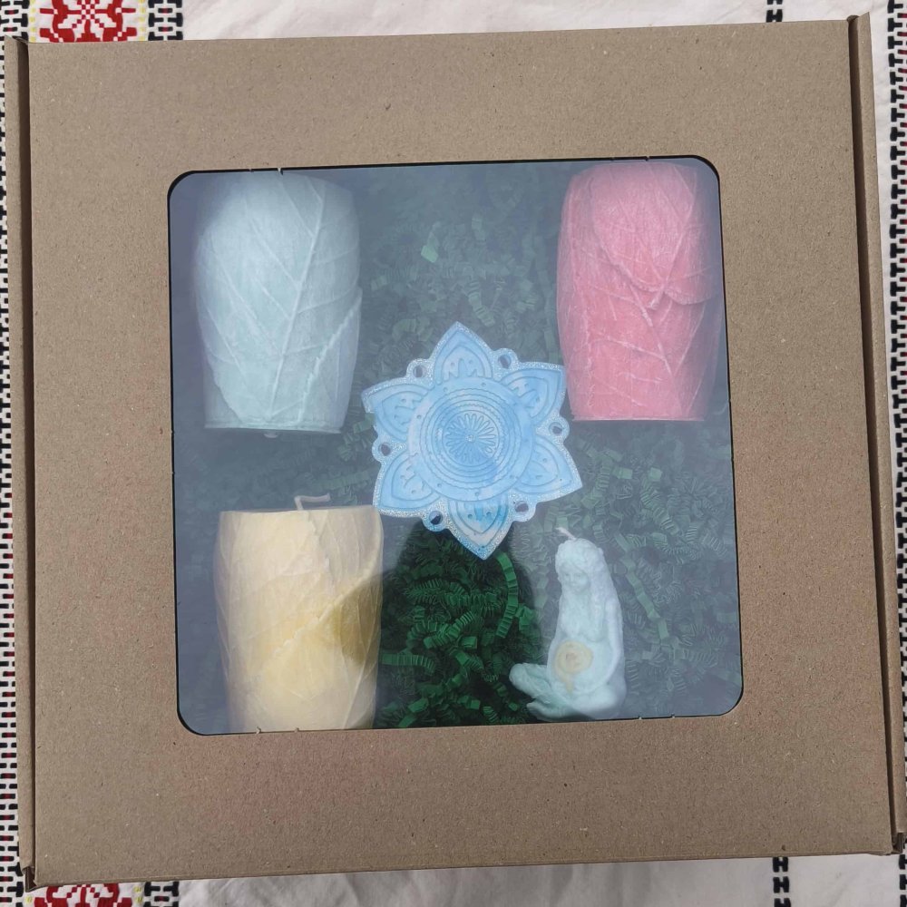 V zeleném hedvábném papíře můžete vidět zabalené podložky a svíčky.